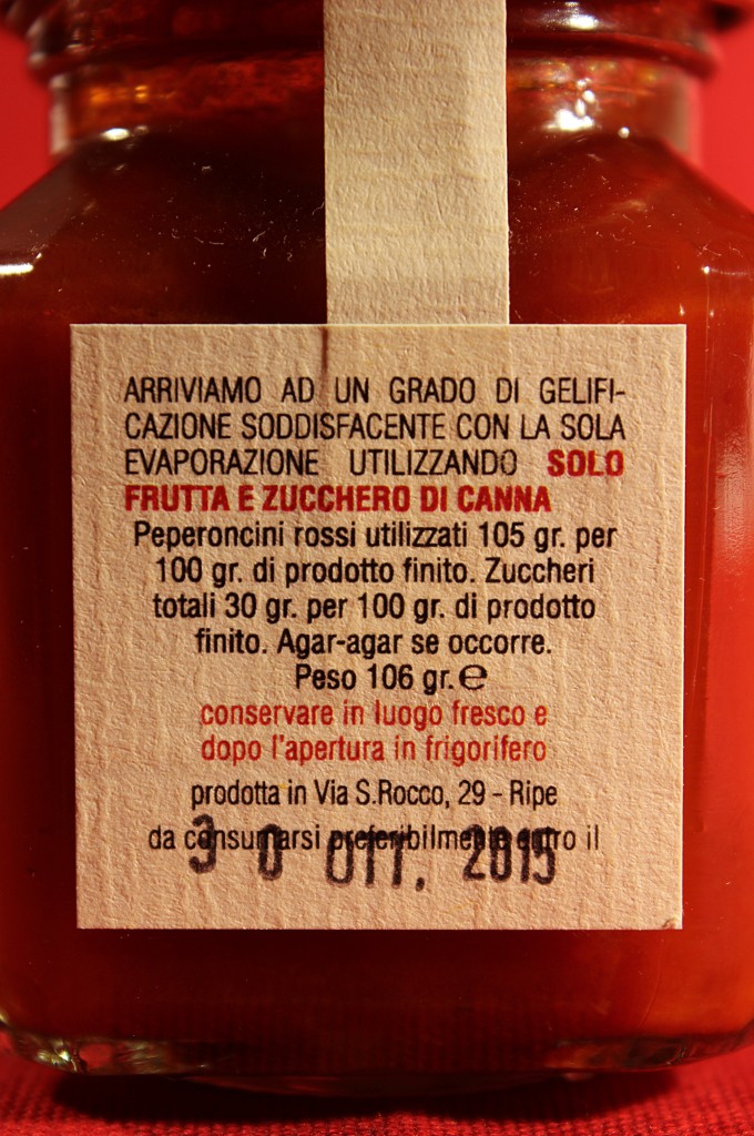 La confettura extra di peperoncini rossi è un prodotto che può stupire a prima vista. In realtà si tratta di un’equilibrata sintesi tra dolce e piccante per la cui preparazione si usano solo ingredienti naturali e genuini, senza aggiunta di coloranti e conservanti. Si tratta di una confettura semimorbida dal profumo di peperoncino maturo, con un sapore dolce e deciso, con un forte retrogusto piccante ed aromatico. Indicata ad accompagnare formaggi teneri, come la ricotta fresca o affumicata, la robiola o i formaggi cremosi, si presta all’abbinamento con wurstel e salsicce arrostite come un’originale alternativa al ketchup, nonché su carni bollite o brasati al posto della mostarda. Vale la pena ricordarne le proprietà antibatteriche e la sua ricchezza di vitamina C e, perché no?, le sue storiche qualità afrodisiache.